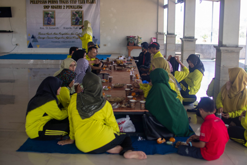 Pada hari Sabtu, tanggal 9 September 2023, bertempat di RM Klangenan, dengan latar belakang pemandangan Objek Wisata Curug Bengkawah di Kabupaten Pemalang, diadakan Pelepasan Purna Tugas (Pensiun) untuk menghormati Bapak Yuli Wuryanto dan Ibu Tri Suswati. Tamu terhormat yang hadir antara lain Bapak Sujarwo, S.E., M.M., Ketua Komite SMP Negeri 2 Pemalang, Ibu Dra. Siti Komariah, M.Pd., Plt. Kepala Sekolah, dan Bapak Edi Purwanto, S.Pd., M.Pd., mantan Plt. Kepala Sekolah sebelumnya, beserta seluruh guru dan karyawan SMP Negeri 2 Pemalang yang berdedikasi.